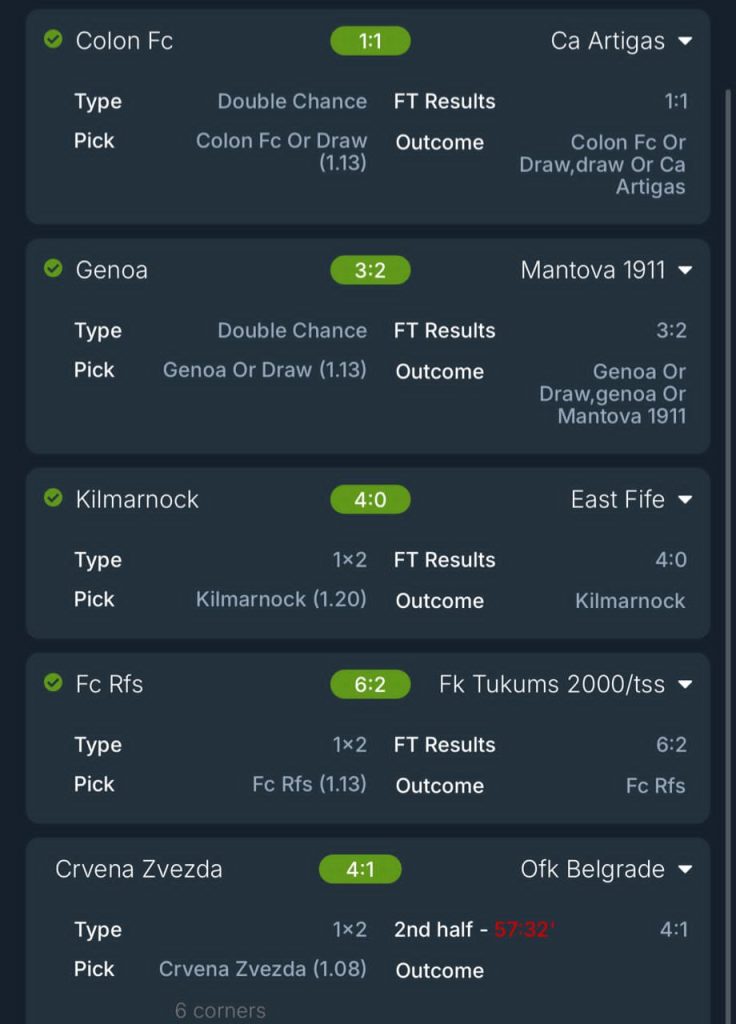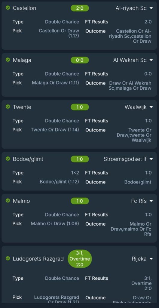 31/AUG/2025 1. Barcelona – Win/ draw2. Liverpool – Win/ draw3. Viking – Win/ draw 30/SEPT/2025 1. Ludogrets – Win/ draw2. Gen – Win/ draw3. Utrecht – Win/ draw 30/AUG/2025 1. Madrid – Win2. Galatasary – Win3. Bayern Munich – Win 29/AUG/2025 1. Ludogrets – Win/ draw2. Gen – Win/ draw3. Utrecht – Win/ draw 28/AUG/2025 1. Ludogrets – Win/ draw2. Gen – Win/ draw3. Utrecht – Win/ draw 27/AUG/2025 1. Bayern – Win2. Man U – Win3. Everton – Win 26/AUG/2025 1. Birmingham – Win/ draw2. Leeds – Win3. Ried – Win/ draw4. Zenit – Win/ draw 25/AUG/2025 1. Inter Milan – Win/ draw2. Al ahly – Win/ draw3. Pyramids – Win/ draw 24/AUG/2025 1. Madrid – Win/ draw2. Ajax – Win/ draw3. Porto – Win/ draw4. Braga – Win/ draw 23/AUG/2025 1. City Vs Spurs – 2 Goals2. Arsenal – Win/ draw3. PSV – Win/ draw4. Atletico – Win/ draw5. Barcelona – Win/ draw 22/AUG/2025 1. Kenya – Score2. Bayern – Leipzig – 2 Goals3. PSG – Win4. Chelsea – Win/ draw 21/AUG/2025 1. Midtylland – Win/ draw2. Malmo – Win/ draw3. SK Bran – Win/ draw 20/AUG/2025 1. Bode/Glimt – Win/ draw 2. Celtic – Win/ draw 3. Dinamo Zagreb – Win/ draw 19/AUG/2025 1. Madrid – Win2. Kaizer Chiefs – Win/ draw3. Dinamo Minsk – Win/ draw 18/AUG/2025 1. Algeria – Win/ draw2. SA – Uganda – 1 Goal3. Dortmud – Win4. Porto – Win/ draw 17/AUG/2025 1. PSG – Win2. Franfurt – Win3. Borussia Mg – Win4. Millian – Win5. Sportung – Win 16/AUG/2025 - Yesterday 1. Mancity – Win/ draw2. Barcelona – Win/ draw3. Spurs – Win/ draw 15/AUG/2025 1. Liverpool – Win 2. Leverkusen – Win 3. South Africa – Win/ draw 14/AUG/2025 Morrow – ScoreMidtjylland – Win/ drawMaccabi tel aviv – Score 12/AUG/2025 1. PSG – Spurs – 0ver 1.52.2. Keflavik – Win/draw3. Basaksehir – Viking – Over 1.5 12/AUG/2025 (Today) 1. Swansea. Win/draw2. Zenit. Win/draw3. Spartak moscow. Win/draw Results for (10/AUG) 11/AUG/2025 1. Porto – win/draw2. Uganda – win/draw3. South Africa 1 goal Results for (10/AUG) 10/AUG/2025 1. liverpool – Win/ draw2. Leiscester – Win3. Al-hilal – Win Results for (10/AUG) 06/AUG/2025 06/AUG/2025 05/AUG/2025 RESULTS 04/AUG/2025 03/AUG/2025 01/AUG/2025 31/June/2025 29/June/2025 25/June/ 2025 26/June/ 2025 Free Football Predictions TimeLeagueMatchesTipsScore 17:00ESTViimsi JK VS TallinnaOver 3.5... 18:00SWEVasteras SK VS Trelleborg1.... 18:00SWEElfsborg VS Goteborg1X... 19:30ROMTuran VS OrdabasyOver 1.5... 18:00POLOdra Opole VS LegnicaX2... 18:00POLGKS Katowice VS Zaglebie1X... 18:00ICEStjarnan VS AftureldingBTTS...